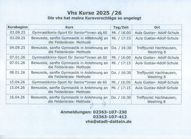Die vhs Datteln meldet in ihrem Internetprogramm unter dem Bereich "Gesundheit" auf der Seite 4, dass mein neuer Kurs