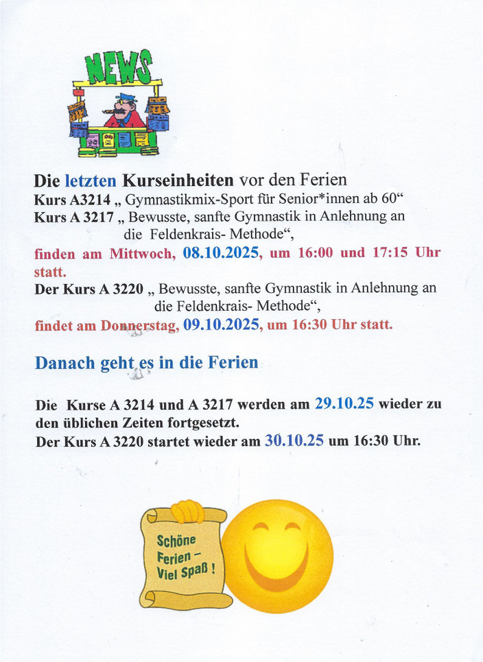 Meine beiden vhs-Kurse "Gymnastikmix - Sport für Senioren ab 60" und "Bewusste, sanfte Gymnastik in Anlehnung an die Feldenkrais-Methode" sind für dieses Jahr beendet. Die jeweils 10 Termine in beiden Kursen haben mir sehr viel Spaß gemacht. Kein Wunder bei diesen netten Teil-nehmern*innen. Die nächsten Kurse starten am Mittwoch, 11.01.2023. Ich würde mich wieder über zahlreiche Anmeldungen freuen. Ich sage Danke